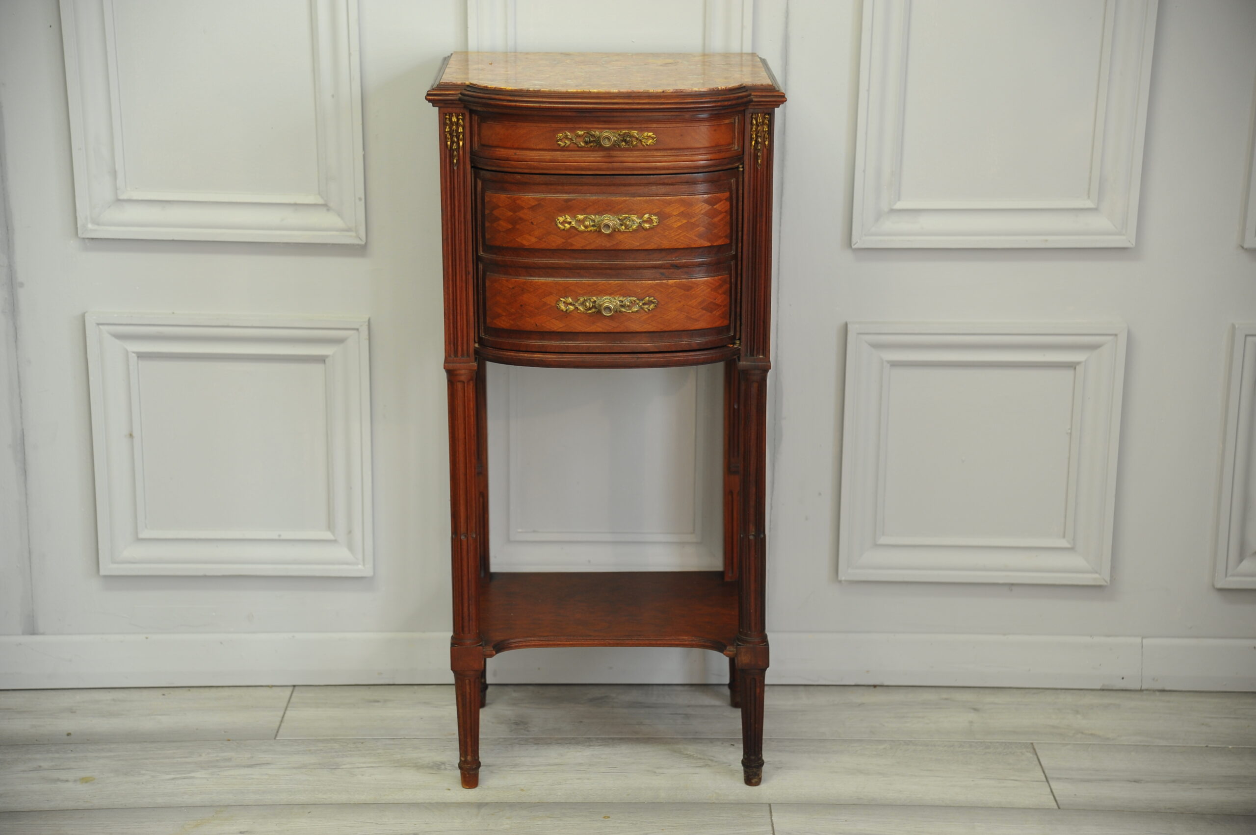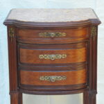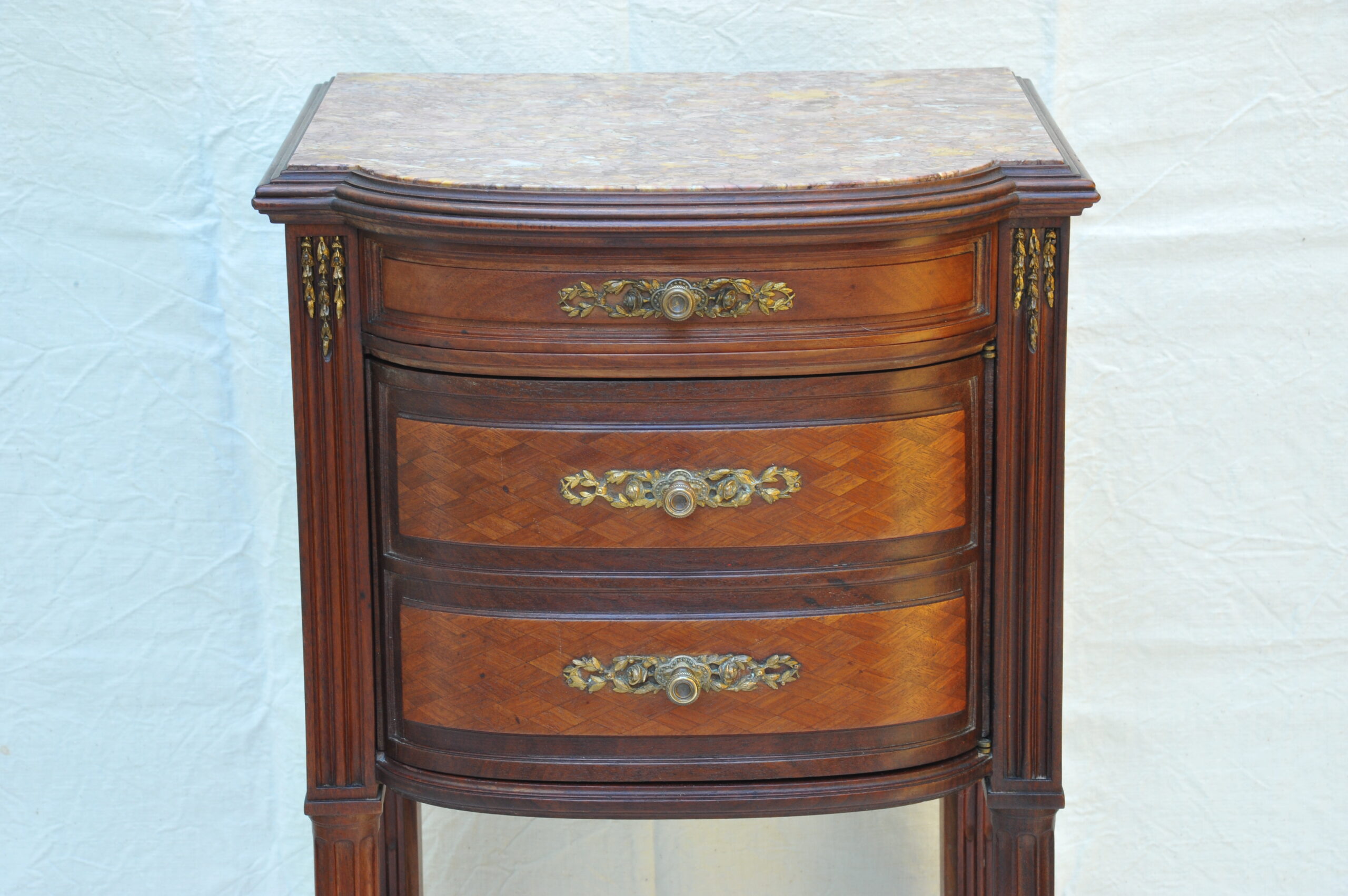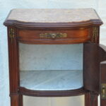 This superb cabinet is of exhibition quality, indeed we were lead to believe this was at the Paris Exposition 1889. This Belle Epoque piece combines the finest selection of timbers and use of techniques, with both reeded and fluted leg detail, a curved door formed from a single piece of Mahogany, good parquetry panel and door and drawer front detail, finished with highly decorative bronze appliques. The Marble top is nicely patterned and the cupboard still retains its’ complete Marble interior. Overall a stunning example of fine craftsmanship and a piece suitable for any room.