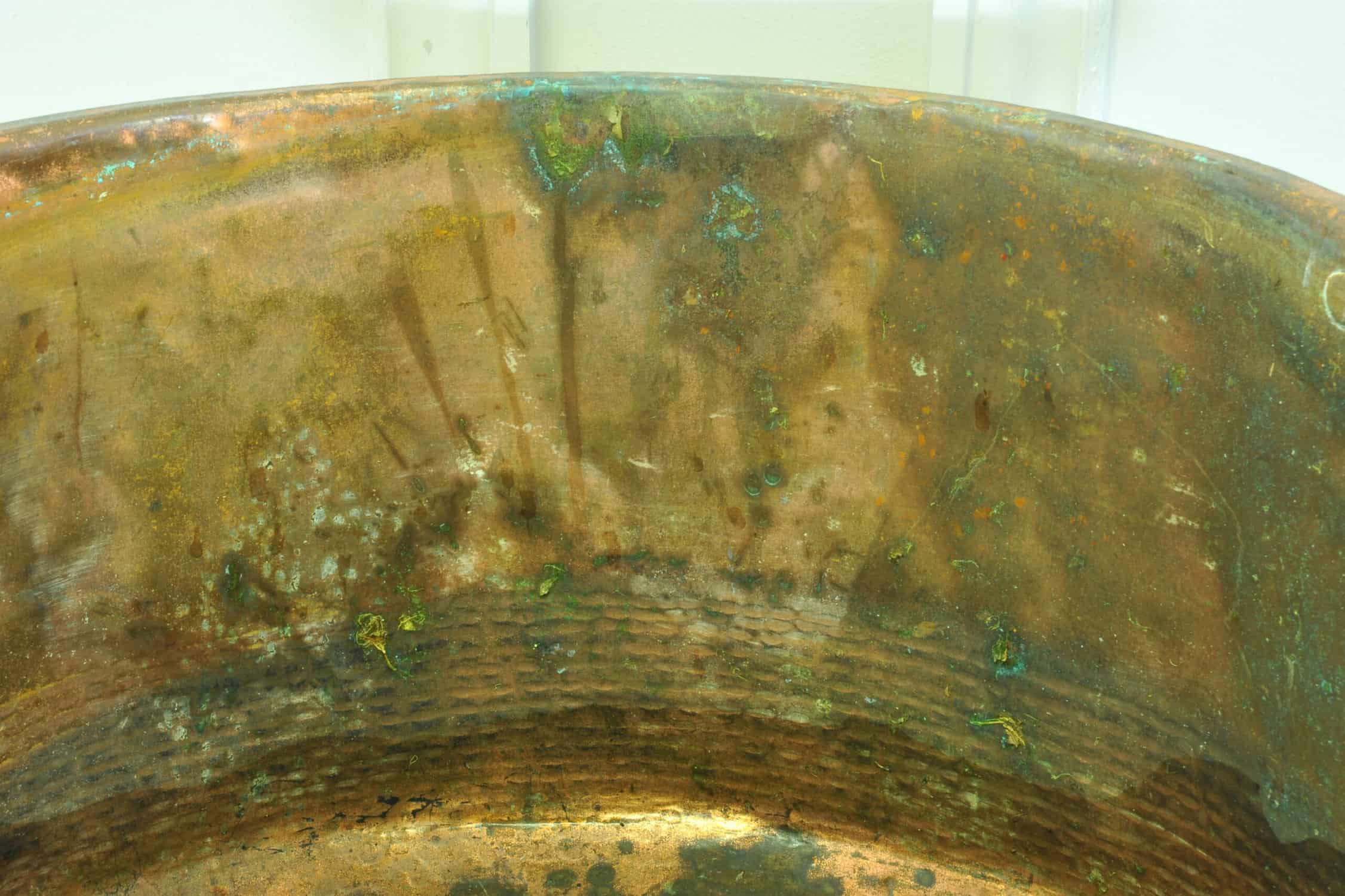 An extremely large antique French Copper Cauldron. This stunning 19c copper would have originally been used for preparing confiture for a very large house or chateau over an open fire. Now typically used as a stunning centre piece at celebrations as a wine cooler, otherwise often used as a fireside log bin or garden planter, whichever way, with a warm not overly polished finish and rare riveted side handles, this is a truly stunning item