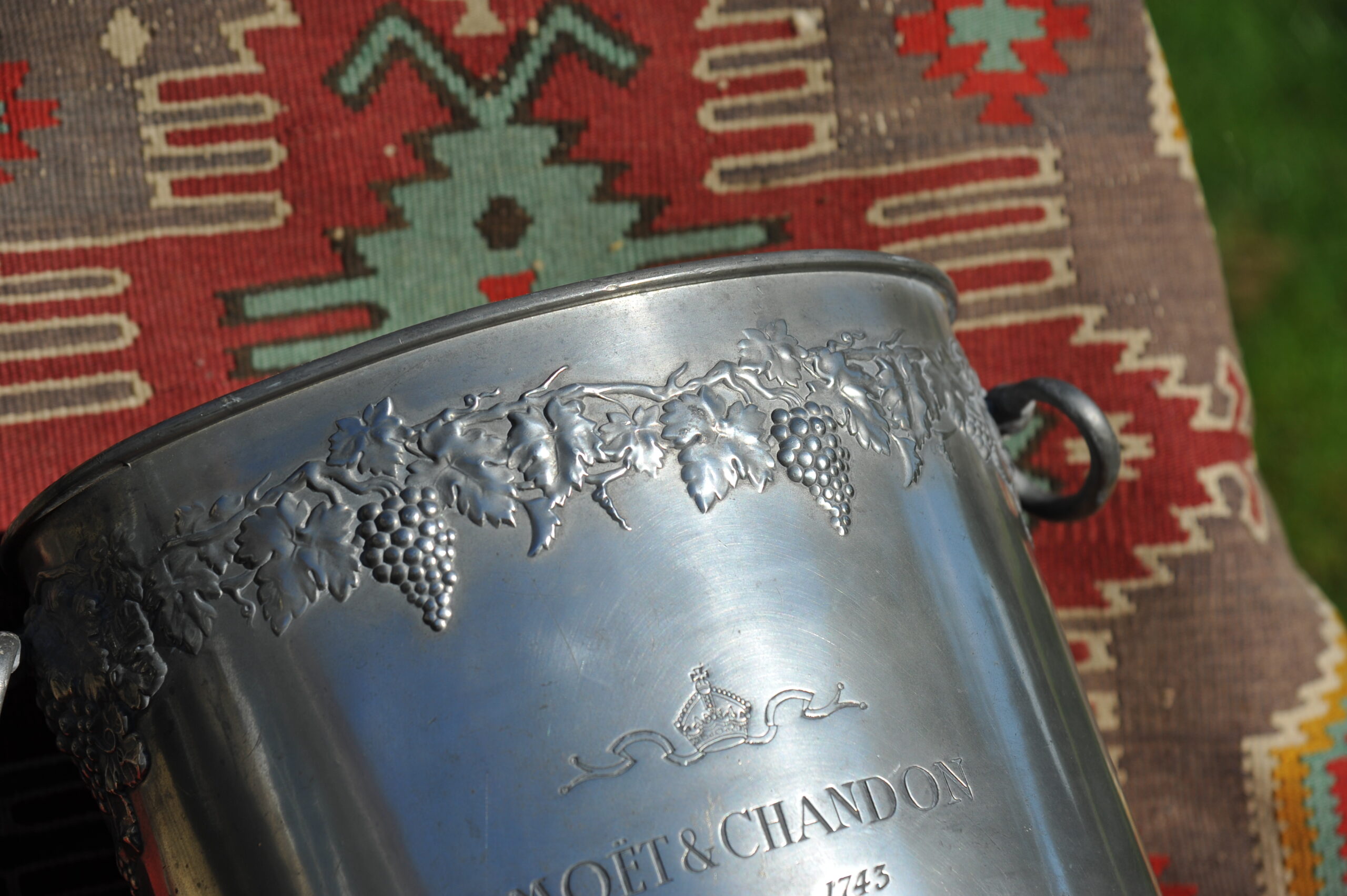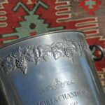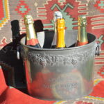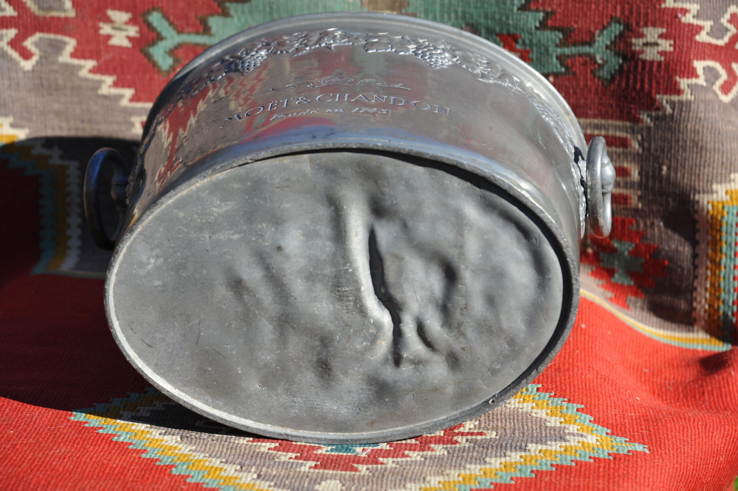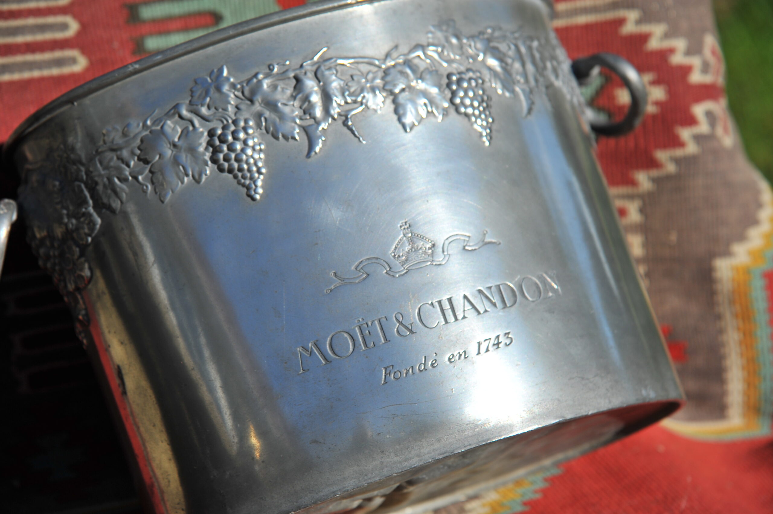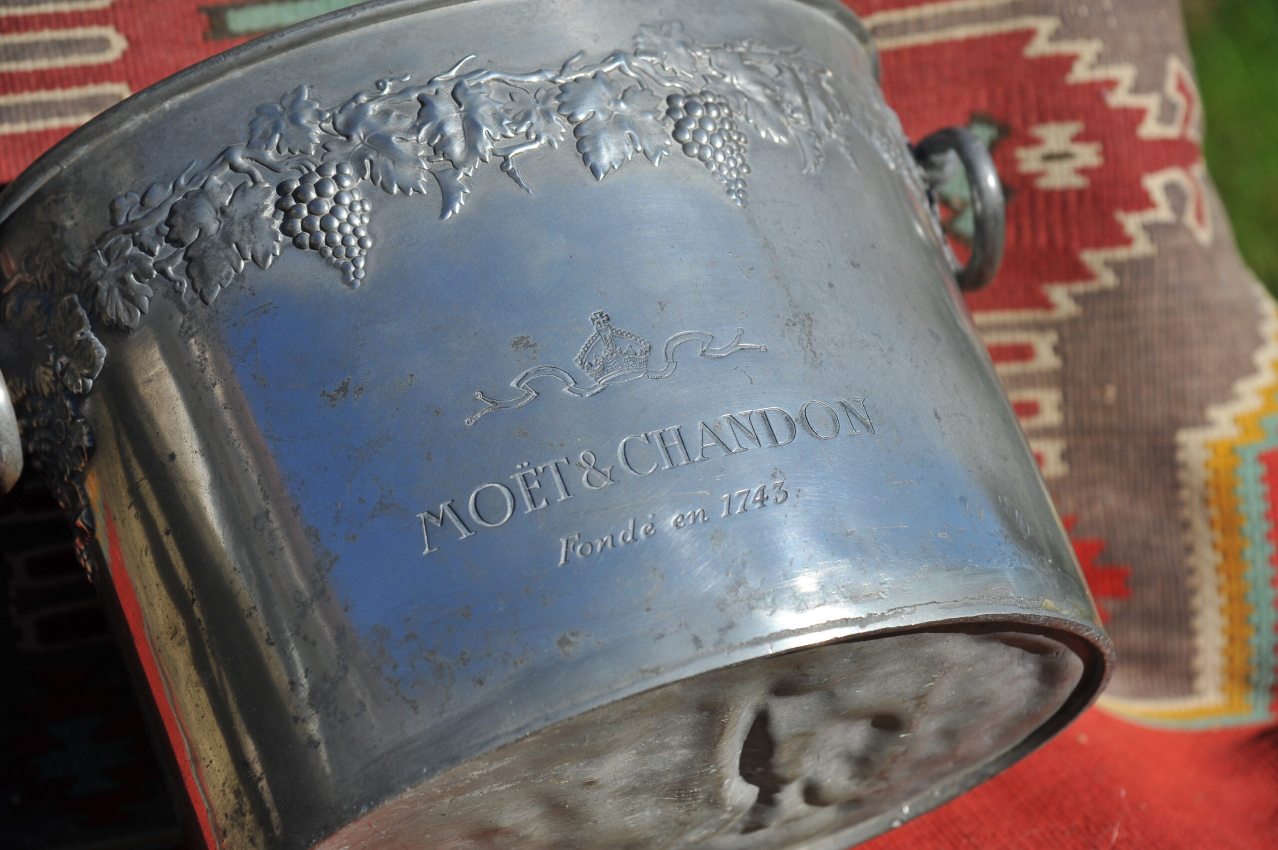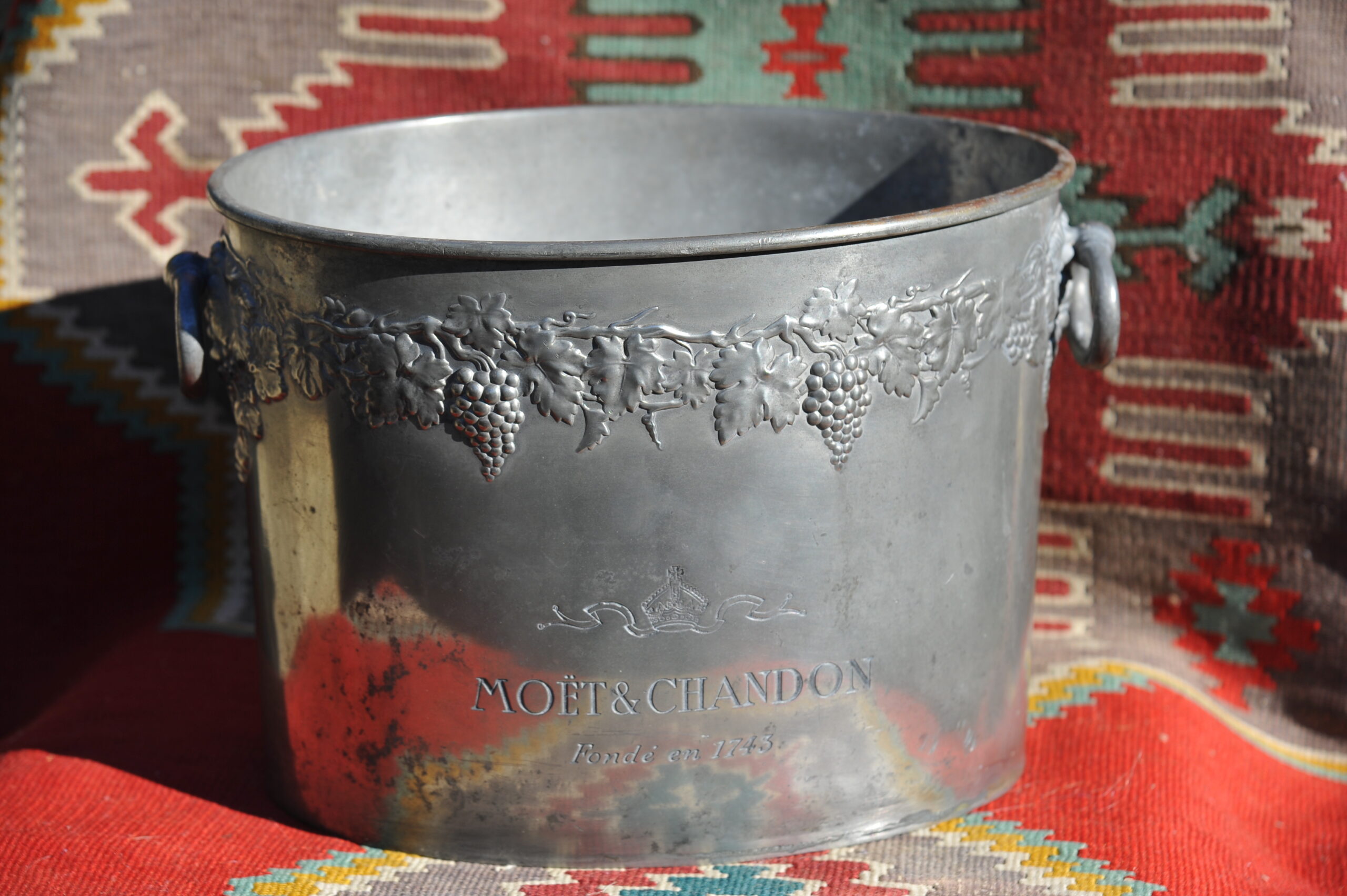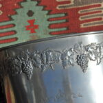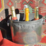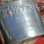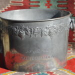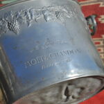 A handsome vintage French ice bucket from Moet et Chandon. In Pewter, this piece was a 1960’s celebratory piece and will hold two magnums or four bottles of Champagne. With a detailed grapevine relief frieze and “Fonde en 1743” engraved on each side, the whole lifted by two substantial ring handles .