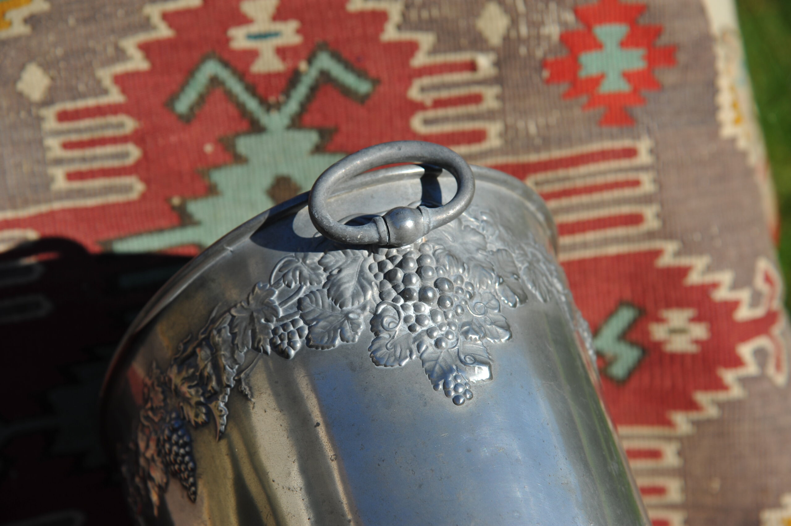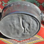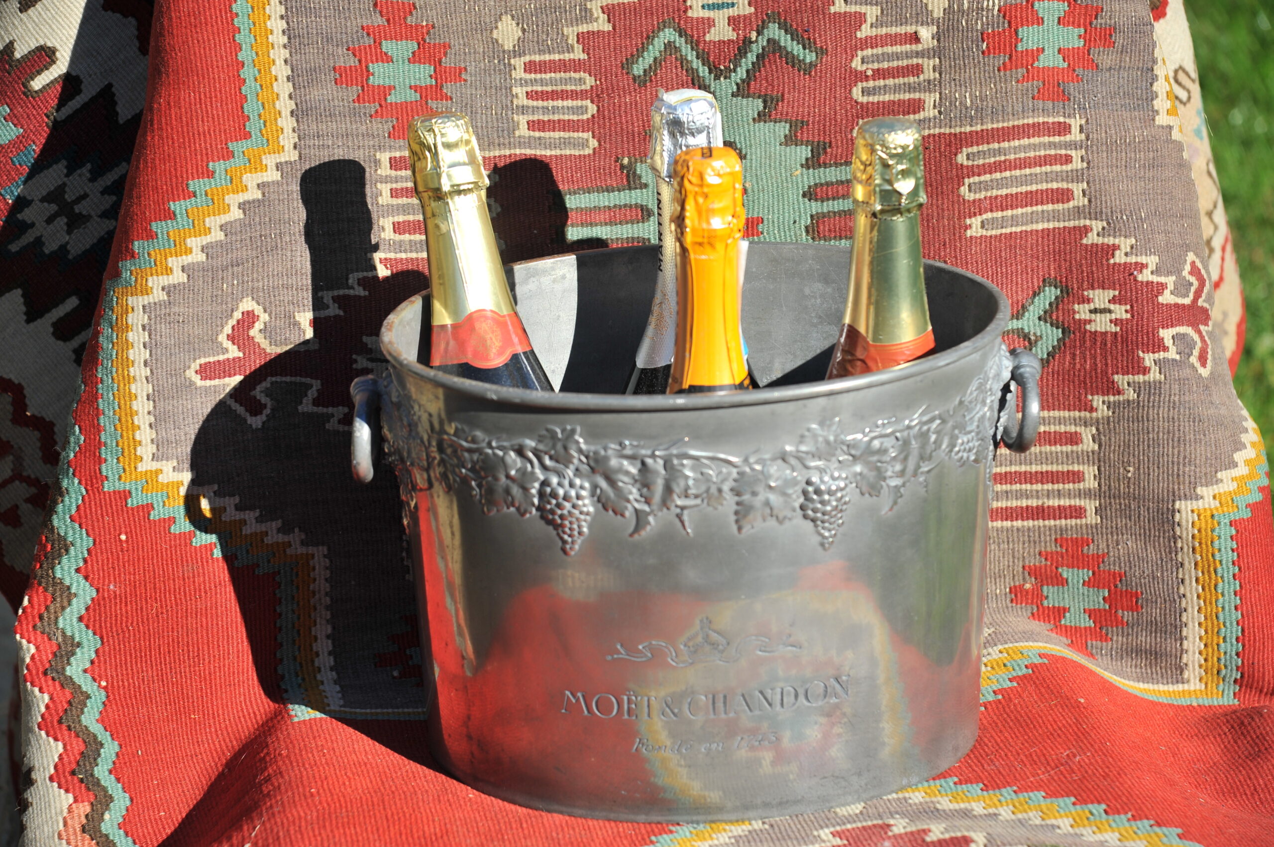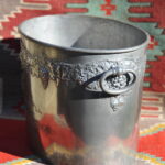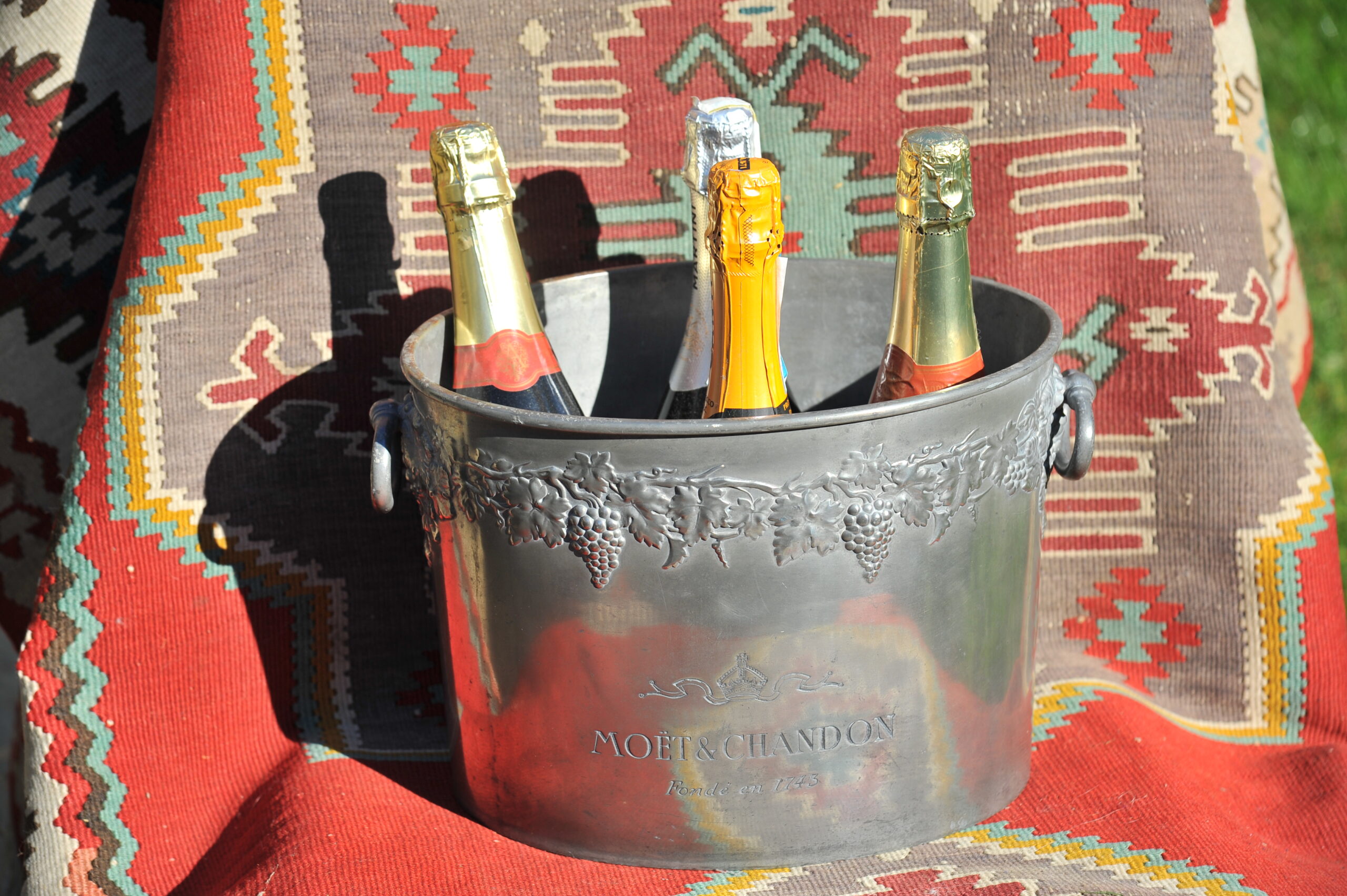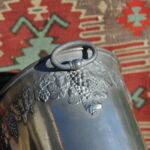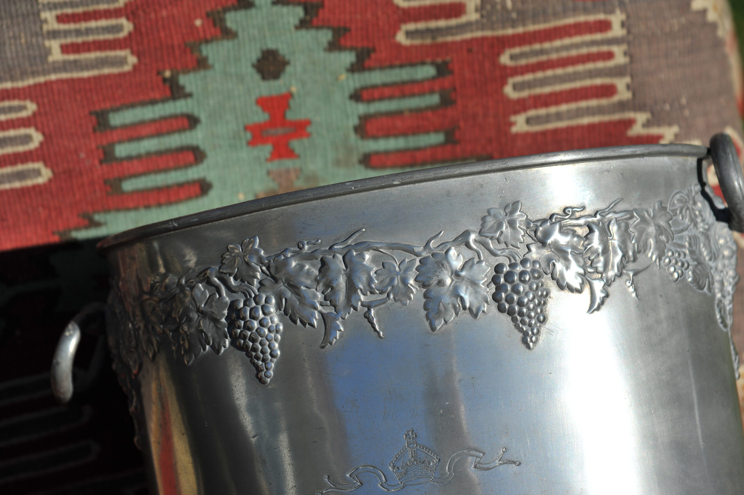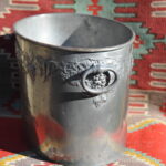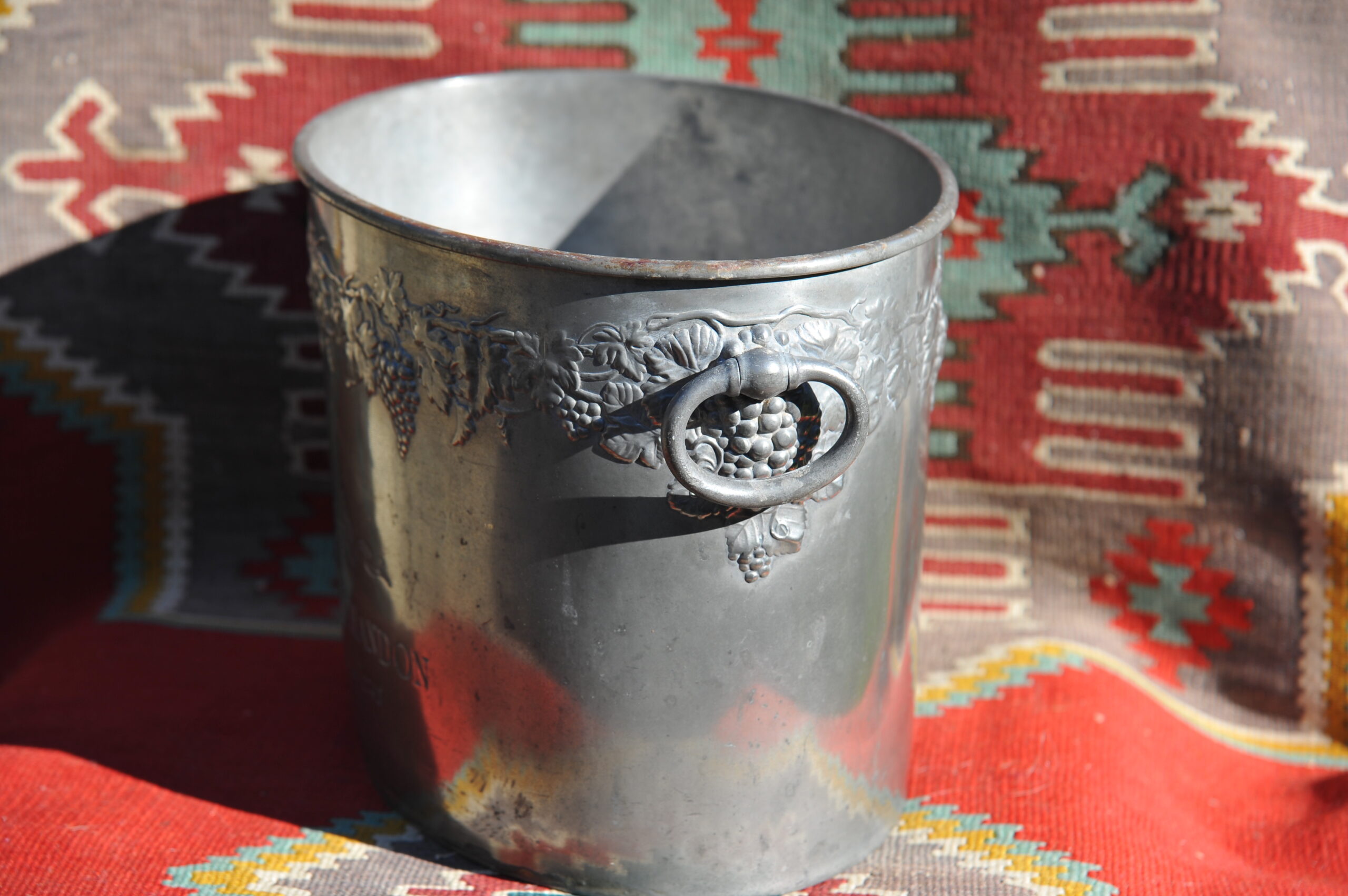 A handsome vintage French ice bucket from Moet et Chandon. In Pewter, this piece was a 1960’s celebratory piece and will hold two magnums or four bottles of Champagne. With a detailed grapevine relief frieze and “Fonde en 1743” engraved on each side, the whole lifted by two substantial ring handles .