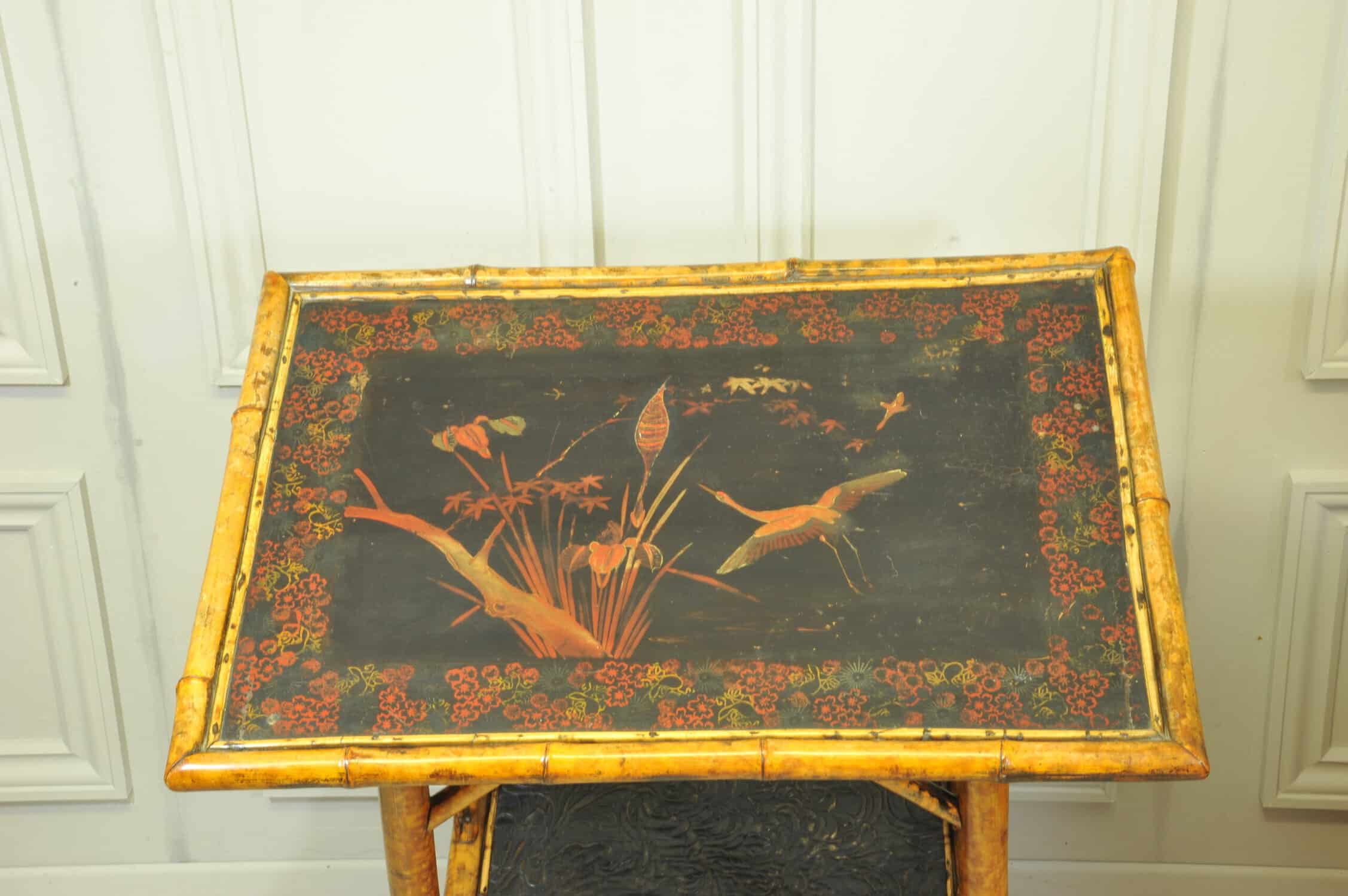 A wonderful example of an English two-tier Bamboo side table, with beautifully figured and detailed bamboo with a rich and warm colour. The upper top is an oriental scene of Flamingo and Reed hand decoration under a good, lacquered finish, unusually detailed and complete. The lower tier is a decorated with an embossed leather panel. Overall, a stunning example of it’s type and of good versatile proportions