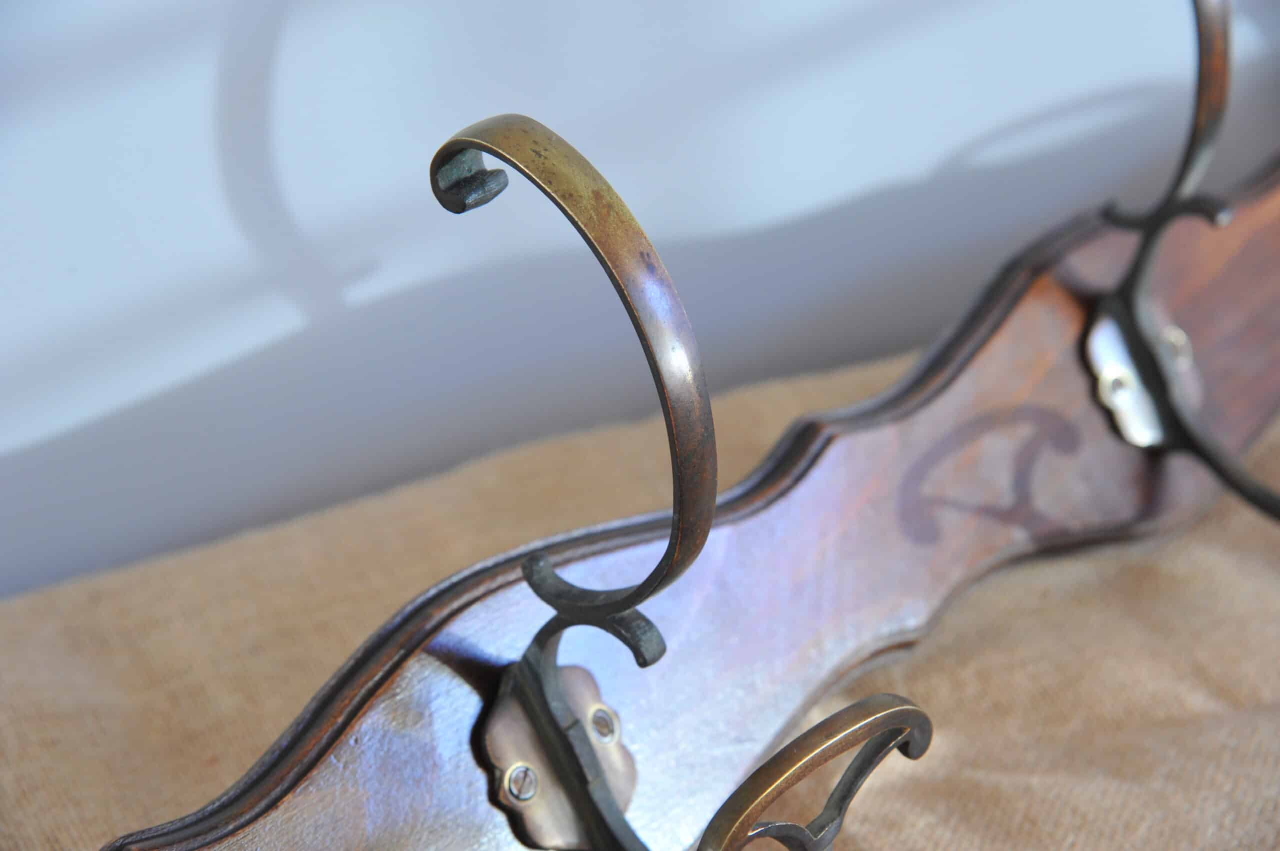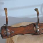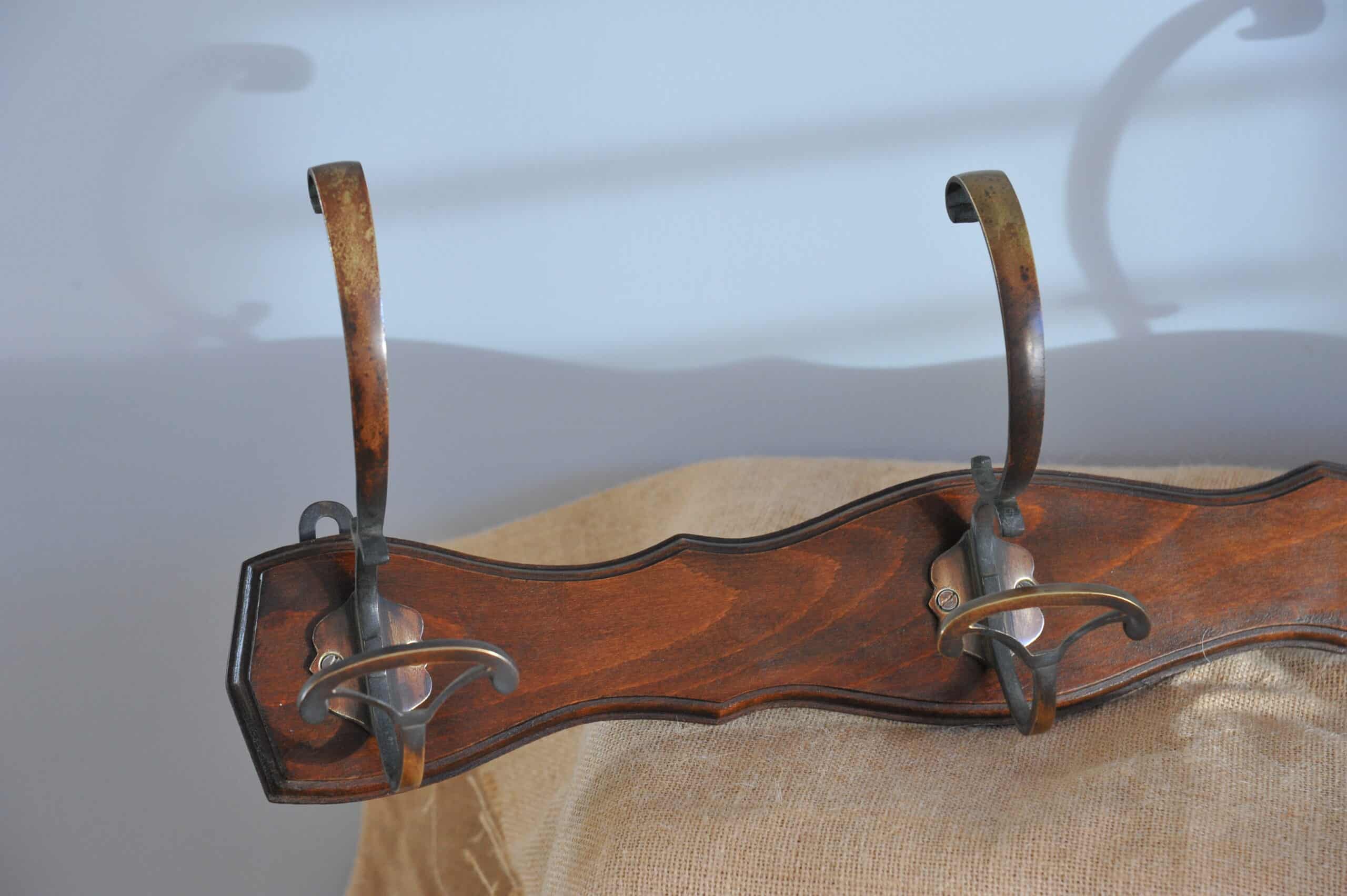 Elegant and charming four branch vintage French wall mounted coat rack with four super stylish beautifully patinated bronze hangars mounted on a polished Beech backboard, this really is an evocative piece that I was lead to believe originally adorned the wall of a hotel in Provence and with this quality and style I have no reason to doubt it!