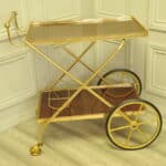 A stunning vintage French Brass drinks cart serving trolley, in a "penny farthing" wheel configuration. There are two fixed shelves with faux wood laminate and brass galleried edges, the lower level has a three drinks bottle holder, the large wheels have turned detail spokes. Complete and ready to go!
